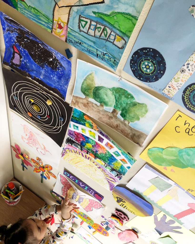 We make space for creativity. It could be an art table in a shared space or personal desks in the kids’ rooms. Isabella and Emma have their desks in their rooms. They have their preferred art tools within reach. Sometimes depending on the activity, the bed or the floor becomes a convenient space too and that’s fine. We have a shared office space that we use for family crafting and other art activities. Olivia uses a portable table that we bring from room to room, as needed. The floor is a favorite space for her, too, when she is drawing or reading.