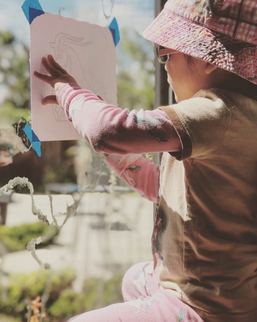 O: Sometimes I think of something I want to draw or make. I get my paper or my sketchbook from my cubby and the color pencils or crayon bin. If I am happy with my drawing Momma helps me hang it at my gallery or on the office door where some of my drawings are. Sometimes I feel like dancing or singing. Alexa is helpful with that. I like singing A Million Dreams and I can read the lyrics now! I like dancing with my sisters. I learned K-pop dancing from my sisters. That was fun!