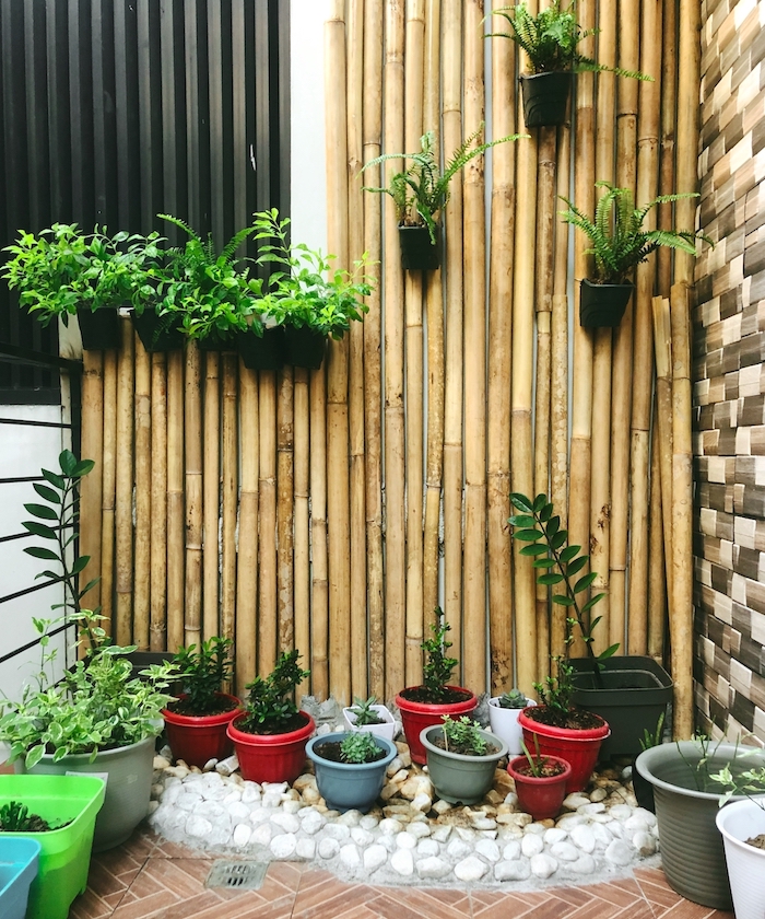 Hanging plants provide more decoration and keep the bamboo from looking too uniform. And the potted plants lining the bottom together with the decorative rocks keep the lower half interesting.