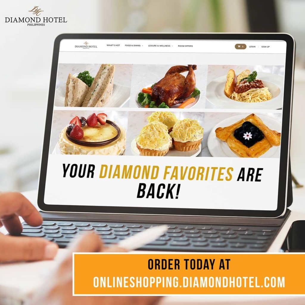 A minimum of P300 is required for an order to be placed. Orders must be placed at least two days before the scheduled pick-up. Payments may be made via credit card, PayPal, or online bank transfers (for Bank of Commerce and Metrobank only). Orders must be picked up at the main entrance of Diamond Hotel Philippines, Roxas Boulevard, cor. Dr. J. Quintos St., Manila daily from 9 a.m. to 5 p.m.