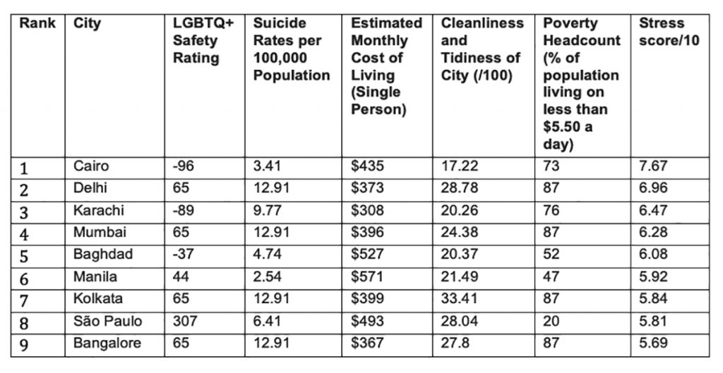 Cairo, Egypt ranked as the most stressed city in the world with a score of 7.67. This was followed by Delhi, India and Karachi, Pakistan with scores of 6.69 and 6.47, respectively.