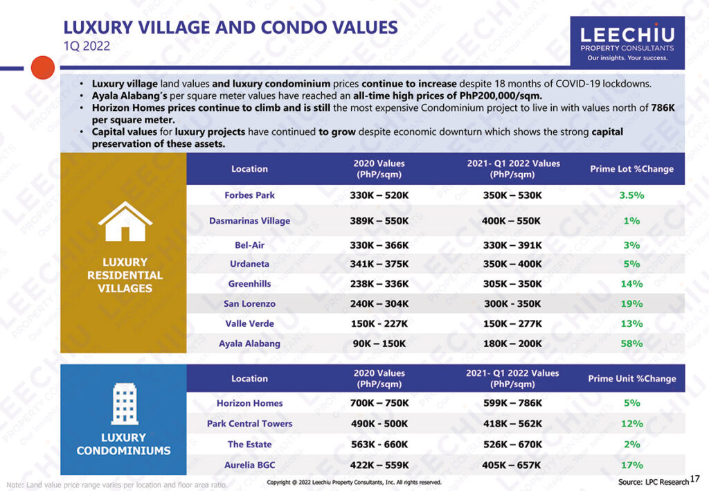 “Capital values for luxury projects have continued to grow despite the economic downturn which shows the strong capital preservation of these assets,” Leechiu Property also said.
