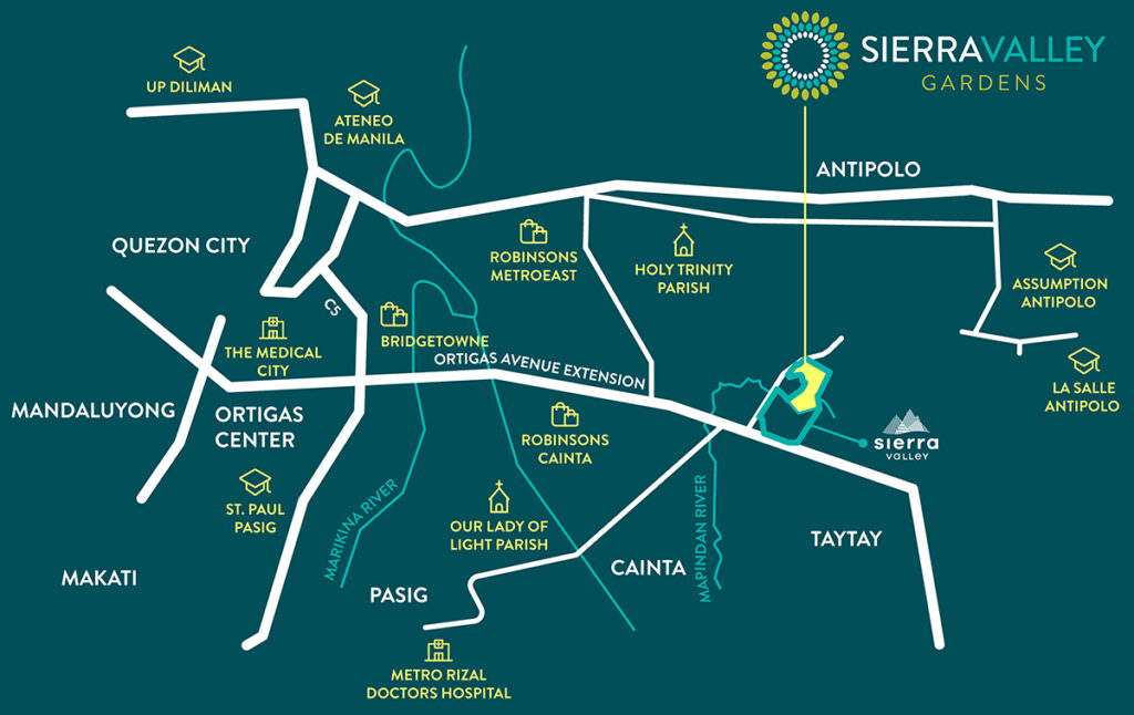 Conveniently located along Ortigas Avenue Extension cor. Suburban Drive, Sierra Valley Gardens is in close proximity to major business districts like Ortigas and Bridgetowne in Pasig; commercial centers like Robinsons Metro East and Robinsons Place Antipolo; universities such as Sienna College of Taytay and La Salle College Antipolo; and medical institutions like The Medical City Ortigas and Metro Rizal Doctors Hospital. As for transportation hubs, Sierra Valley Gardens is less than 10 kilometers away from LRT 2 Santolan Station. In addition, the Premium Point-to-Point (P2P) terminal going to and from Robinsons Galleria and Makati is just within the Sierra Valley estate.