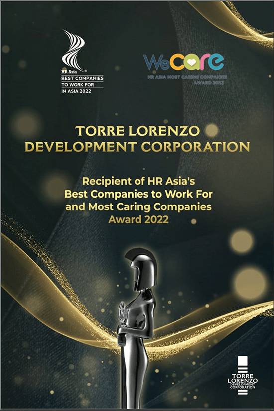 Torre Lorenzo was also recognized as one of HR Asia’s Best Companies to Work For in 2022. The Company was also a recipient of HR Asia’s Most Caring Companies Award 2022. Out of 185 Filipino companies that took part in HR Asia’s proprietary Total Engagement Assessment, only the top 35 companies were named as HR Asia’s Best Companies to work for in Asia 2022. From this roster, only six companies were given the Most Caring Companies Award 2022.