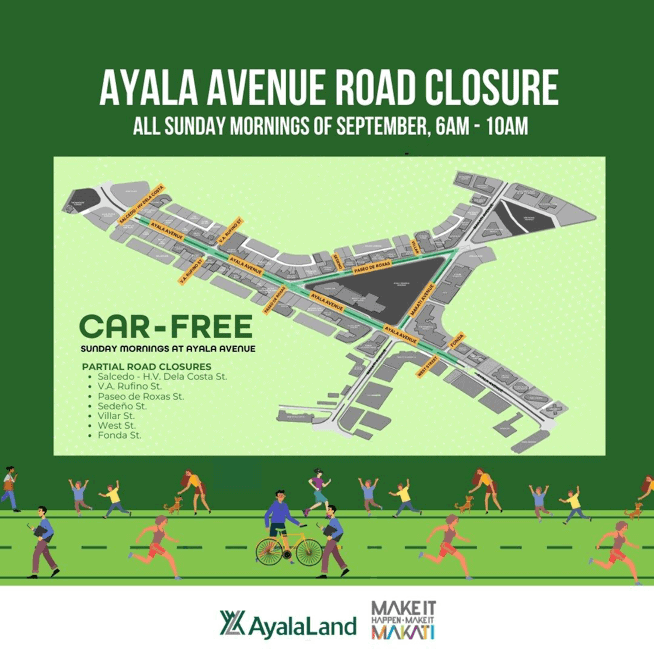 Starting this September 3, 2023, the entire stretch of Ayala Avenue will be closed off to motorists every morning from 6:00 a.m. to 10:00 a.m. The car-free area covers the entire stretch of Ayala Avenue from Salcedo-H.V. Dela Costa St. to West St. & Fonda St. There will also be partial road closures on Sedeno St., Villar St, and other adjoining streets.