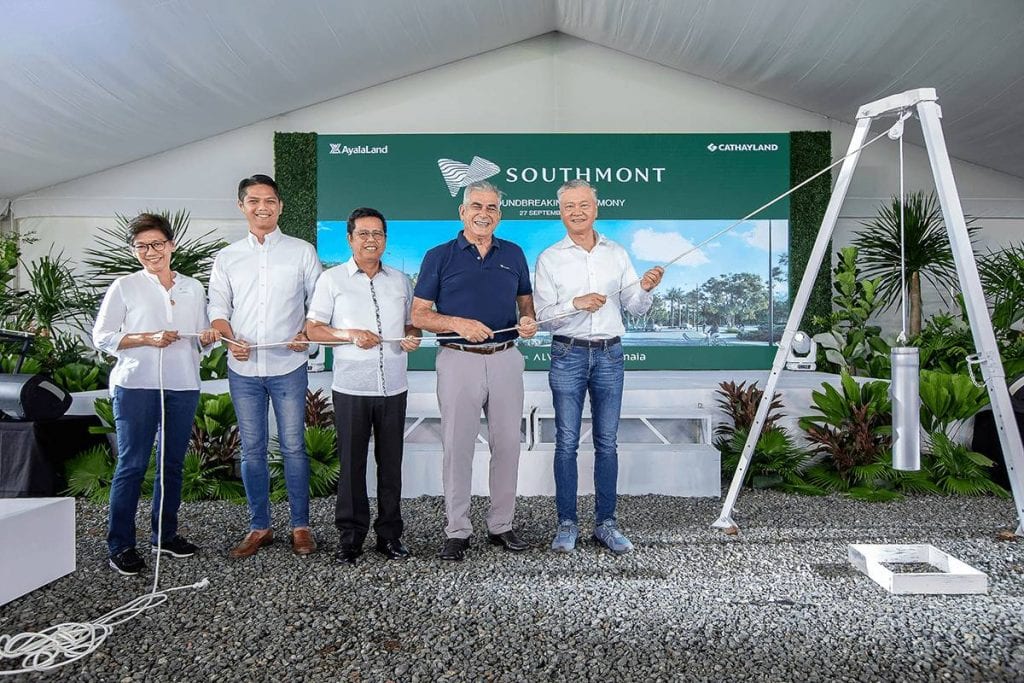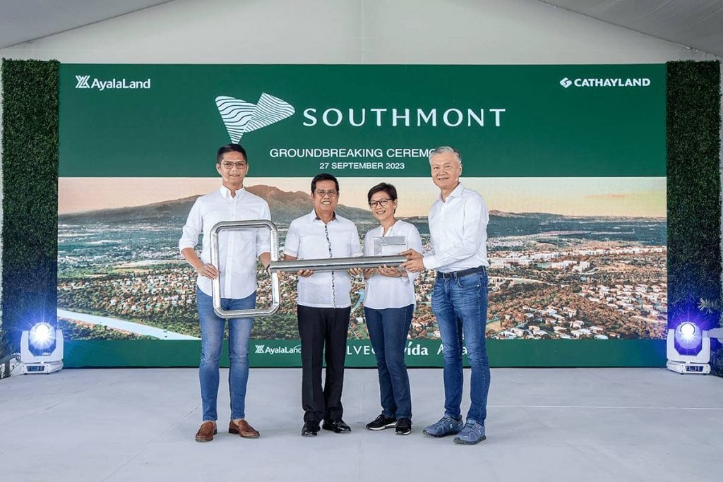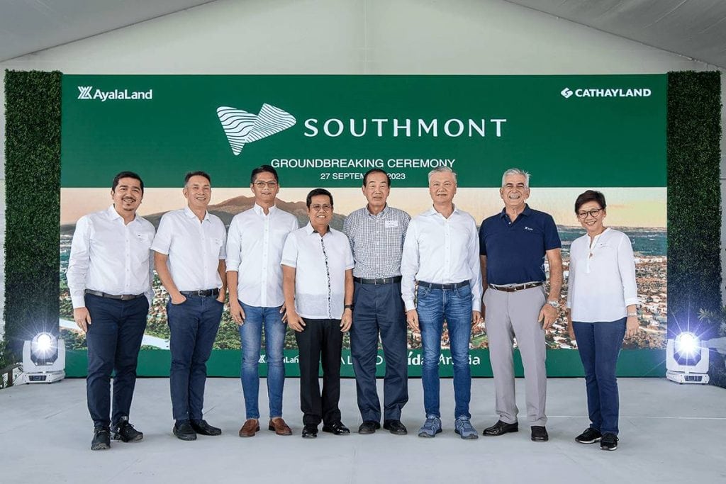 Cathay Land president Jeffrey T. Ng, Cathay Land executive VP Jose Balonan, Ayala Corporation chairman Jaime Augusto Zobel de Ayala, and Ayala Land executives, along with government officials Silang Mayor Kevin Anarna, and Cavite 5th District Representative Congressman Roy Loyola during the ground-breaking ceremony of Southmont