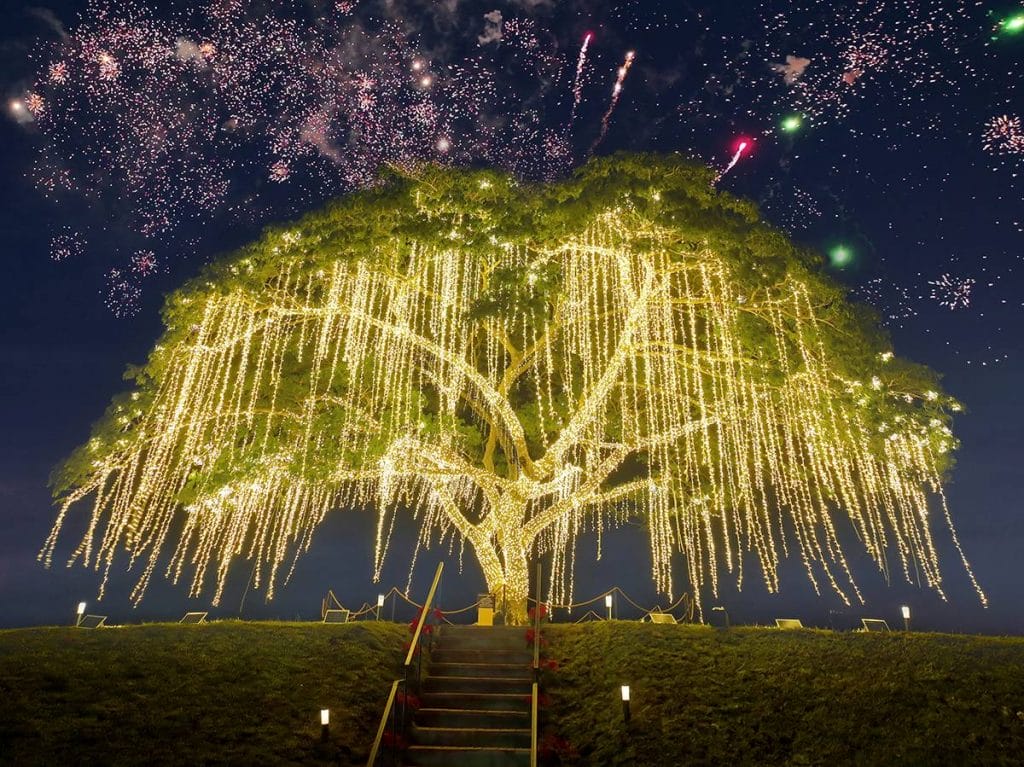 The Heritage Tree stood majestic with its bright, radiant lights, enhanced further by a spectacular, colorful fireworks display, illuminating the expansive grounds of Villar City.