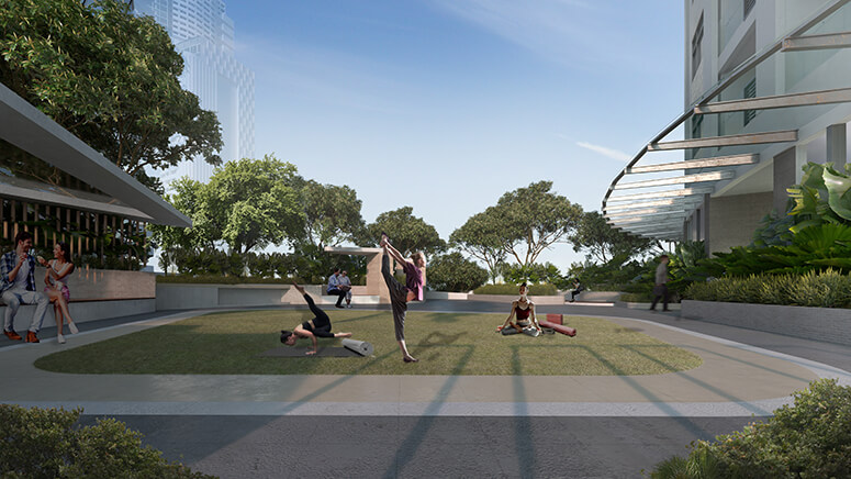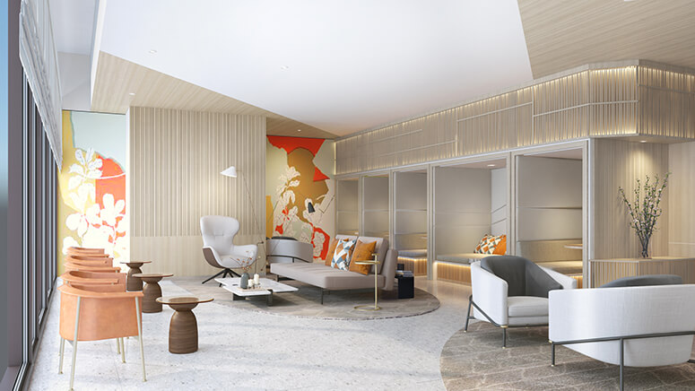 Artist;s perspective of tower amenities; reading room, pool and outdoor quiet zone