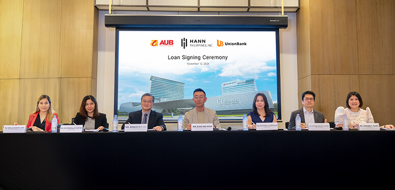 LtoR: Ms. Shella Marie E. Lipio, Assistant Vice President, Asia United Bank Corporation-Trust & Investments Group, Ms. Kristeen Ella M. Reyes, Senior Vice President, Asia United Bank Corporation, Mr. Ernesto T. Uy, Executive Vice President, Asia United Bank Corporation, Mr. Dae Sik Han, Chairman & CEO, Hann Philippines, Inc., Ms. Mitchell A. Estacio, Vice President for Finance, Hann Philippines, Inc., Mr. Antonino Agustin A.S. Fajardo, Executive Vice President, Union Bank of the Philippines, Ms. Jessine Y. Gamo, Vice President, Union Bank of the Philippines