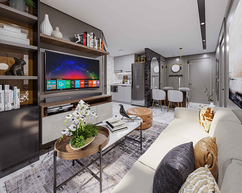 A two-bedroom dressed-up render for a unit in Metrotowne, a medium-rise development in Las Pinas by PHINMA Properties. It is a 2.1-hectare development designed with five 15-storey residential buildings and a total of 1,650 modern contemporary designed units.