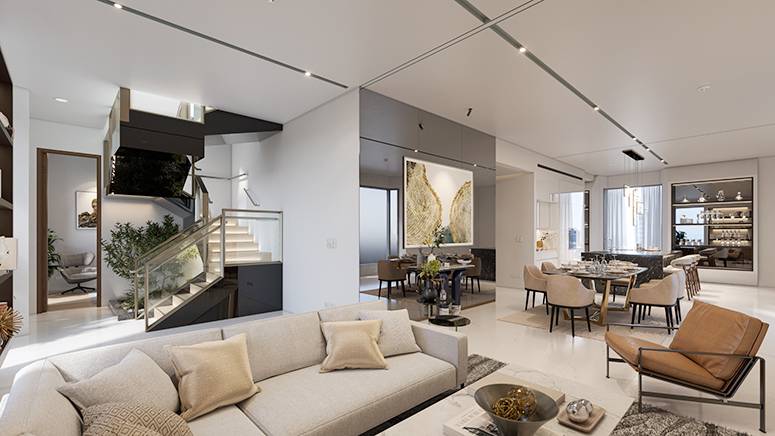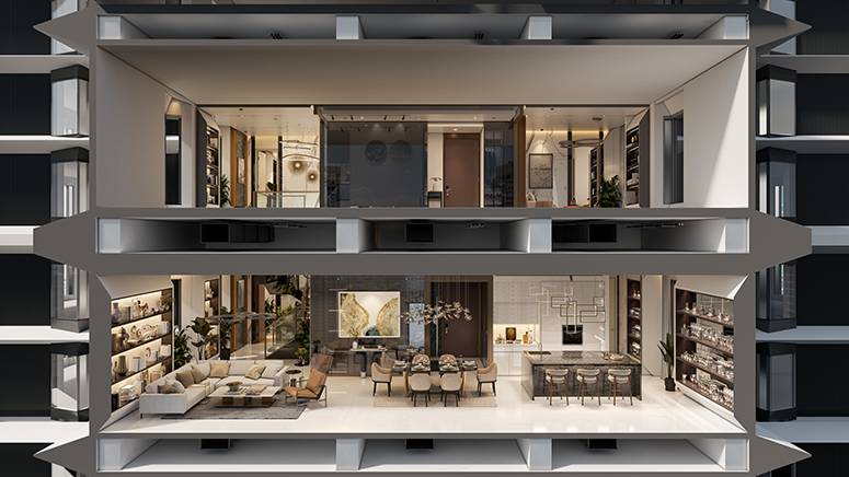 Angular windows provide residents with private, panoramic views ranging from 180° to 270°, while double-glazed glass ensures cooling efficiency and acoustic insulation. For those seeking even more grandeur, the limited bi- level suites feature distinct spaces for entertainment and privacy. These suites include expansive living and dining areas on the first level, while bedrooms and en- suite master baths are located on the second level, with a central family area as a convergence point.