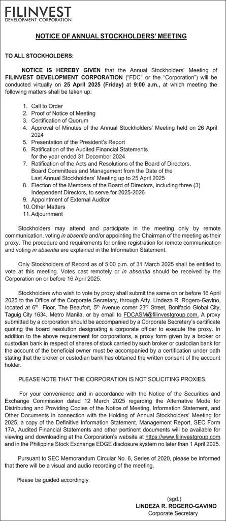 Filinvest gives notice of annual stockholders’ meeting