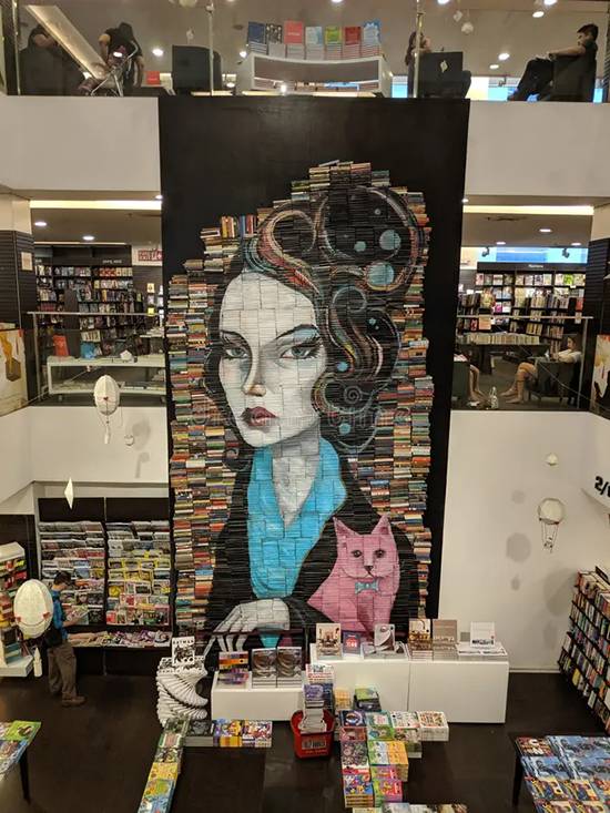 A key element of the BGC branch is a book sculpture made of approximately 3,000 books at its center which was made by LA-based artist Mike Stilkey.