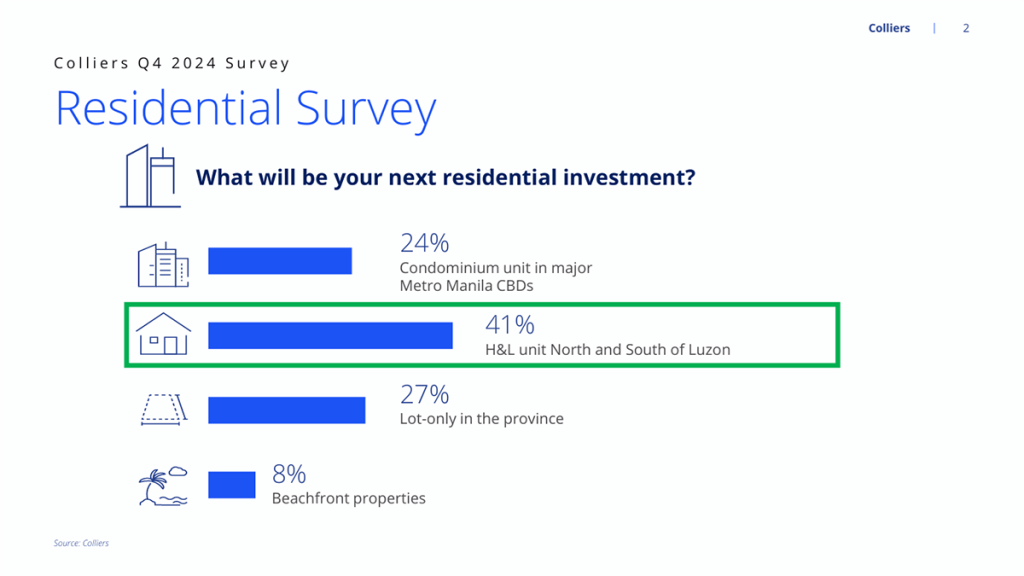 It is also interesting that when asked about their next residential investment, close to 70% of our respondents chose house-and-lot (H&L) or lot-only units in North or South Luzon for their next residential investment. Among the most attractive sites in these regions are Cavite, Laguna, Batangas, Pampanga, Bulacan and Tarlac. H&L projects in these property hotspots recorded an average annual price increase of 3% to 6% from 2016 to 2024.