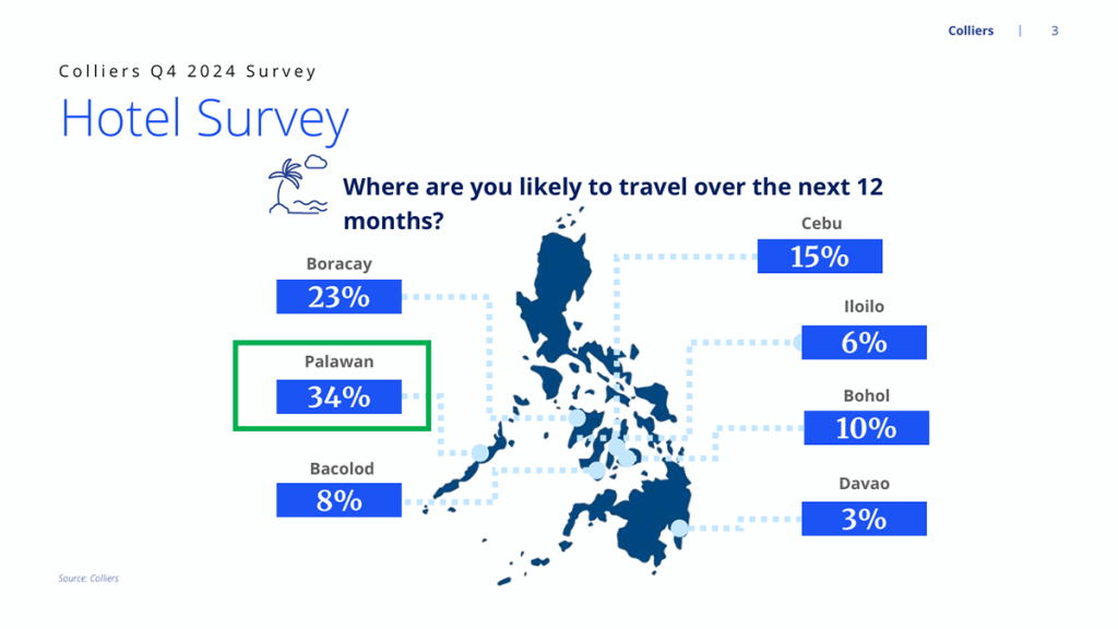 For the leisure sector, Palawan has consistently ranked as the preferred destination of our respondents. During our Q2 2021 poll, Palawan was the top choice, being chosen by 43% of our respondents. More than 3 years since our first survey, Palawan re-emerged as the preferred destination, followed by Boracay (23%) and Cebu (15%). Meanwhile, Bohol captured 10% of the total votes. In 2024, Palawan ranked 13th among the 25 locations included in the Travel+Leisure’s 2024 World’s Best Islands list. In 2025, Palawan was also shortlisted for this year’s awards alongside Panglao Island in Bohol, Mactan Island in Cebu and Boracay Island in Aklan.