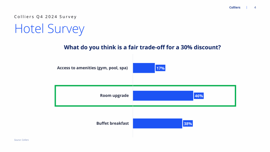 Interestingly, when asked about a fair trade-off for a 30% discount, about 46% of our respondents prefer room upgrade as a fair trade-off for a 30% discount on room rate, followed by buffet breakfast at 38% and access to amenities at 17%.