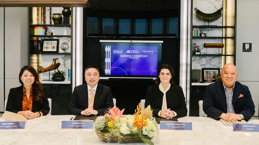 (From L-R) Maria Ariizumi, vice president, Development, South East Asia, Hilton; Clarence Tan, senior vice president, Development, Asia Pacific; Mariana Zobel de Ayala – Senior Vice-President, Leasing and Hospitality Ayala Land, Inc.; and George Aquino – President and CEO, Ayala Land Hospitality