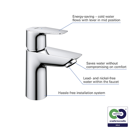 Strengthening its commitment to circular design, GROHE has introduced new Gold-level certified products, including the BauEdge S-Size, Eurosmart S-Size, Eurosmart Kitchen, and the Tempesta shower rail set. Gold certification requires stricter standards, with only the purest materials permitted in production.