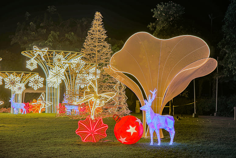 Central Park serves as the visual anchor of this year’s Christmas installations, distinguished by oversized snowflakes, botanical accents, and a towering Christmas tree designed to draw families and office workers back into the township’s heart. Creekside is illuminated with snow-colored reindeer and crystal-themed pines, while the area around the Chapel features glowing butterflies and floral elements that soften the surroundings and create a quiet, contemplative atmosphere.