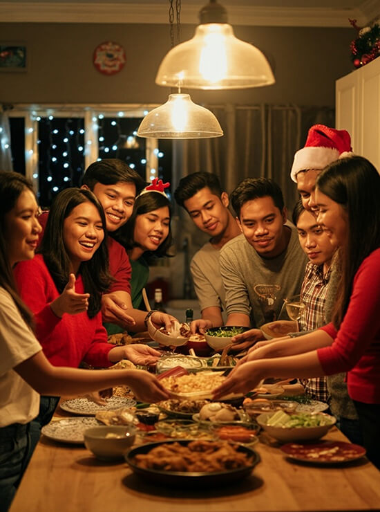● Noche Buena: Held just after midnight Mass, the dining table holds a lavish spread of Filipino favorites like Lechon, Queso de Bola, Christmas Ham, Pinoy Spaghetti, and Lumpia. For OFWs, this is a moment for collective thanksgiving through shared food and stories. Make this more memorable for your loved ones by ensuring that their favorite dishes will be included in the Noche Buena spread, so they feel truly special and cared for. If possible, have family members prepare these dishes together for a fun bonding activity.