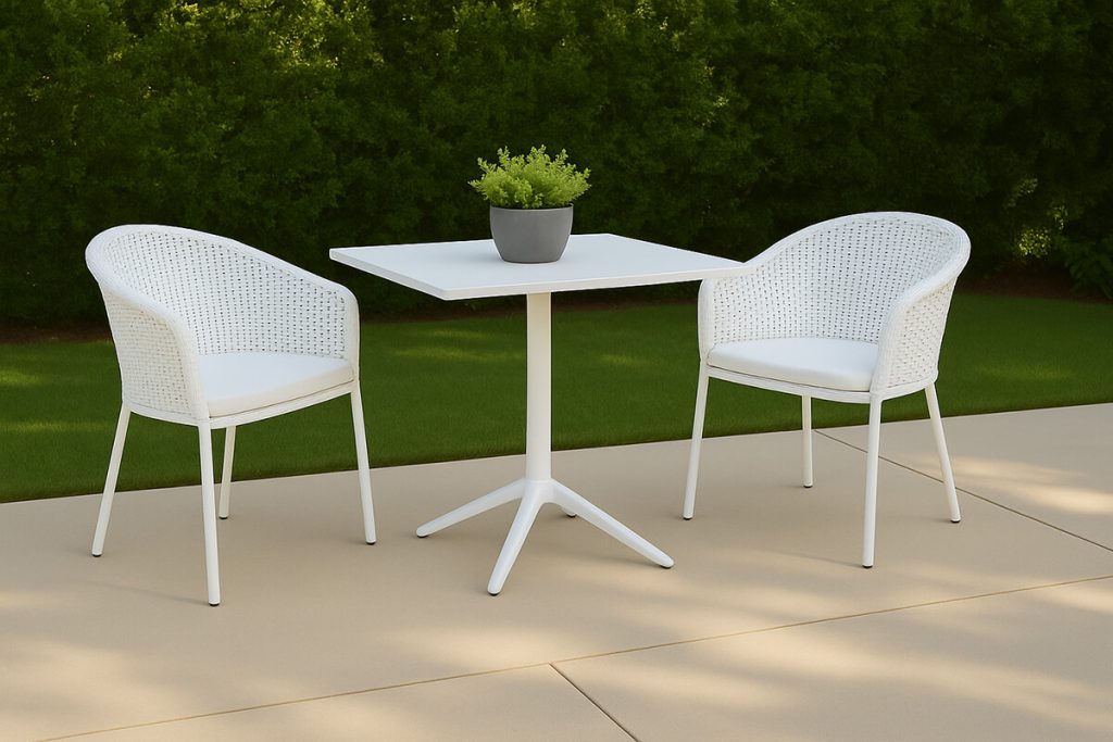 The Heim White Parda 2-Seater Dining Table with matching Parda Dining Chairs offers a fresh, minimalist look that works beautifully on patios, balconies, or garden corners. Finished in white, the set reflects natural light and enhances the feeling of openness—perfect for relaxing breakfasts or quiet evenings outdoors.