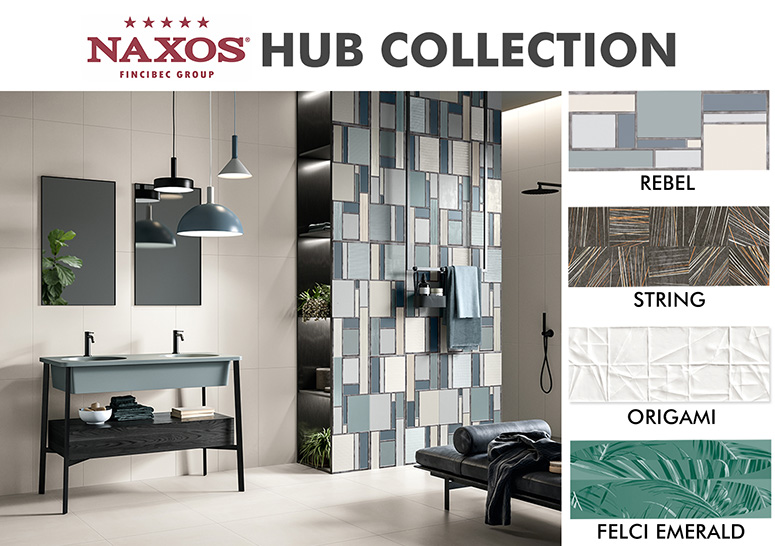 Create and feel the perfect texture in your bath space with exciting tile pieces from Naxos. The Naxos Hub Collection presents original graphical elements and a texture palette ideal for your accent wall. It combines natural inspirations and eclectic visual impressions in clean, sometimes asymmetrical patterns. You can bring an Italian flair inside your bathroom, for example, as as you choose from designs in matte surfaces, rectified edges, and with different sizes and thicknesses. Showcase your creativity and style and create a contemporary bathroom design with Naxos Hub Collection. Choose from these designs and colors: Rebel, String, Origami, and Felci Emerald.