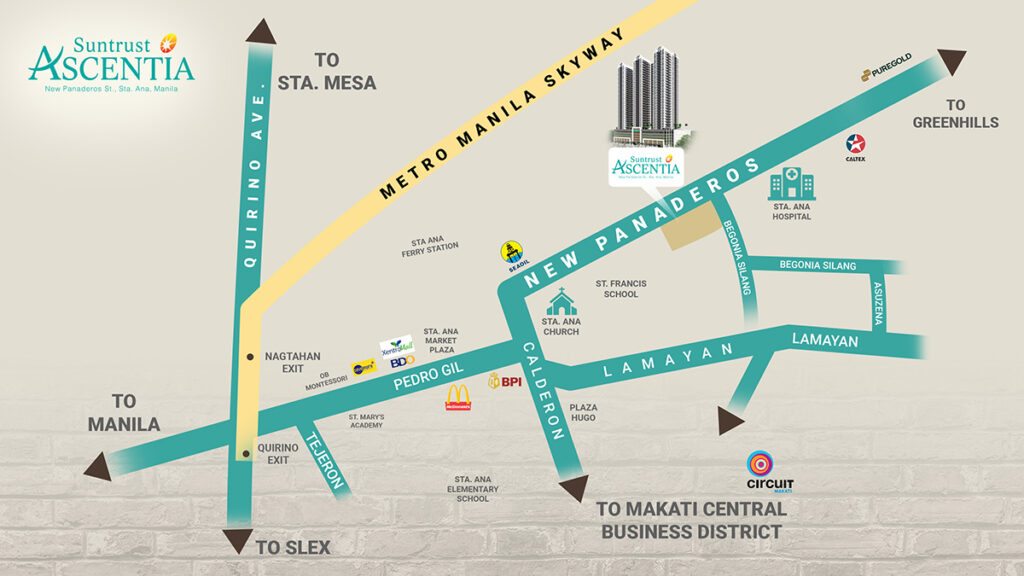 In terms of mobility and transport, Suntrust Ascentia is also accessible through the Quirino Avenue Skyway Exit, Nagtahan Skyway Exit, and the South Luzon Expressway (SLEX), as well as transport systems LRT Line 1 and the Sta. Ana Ferry Terminal.