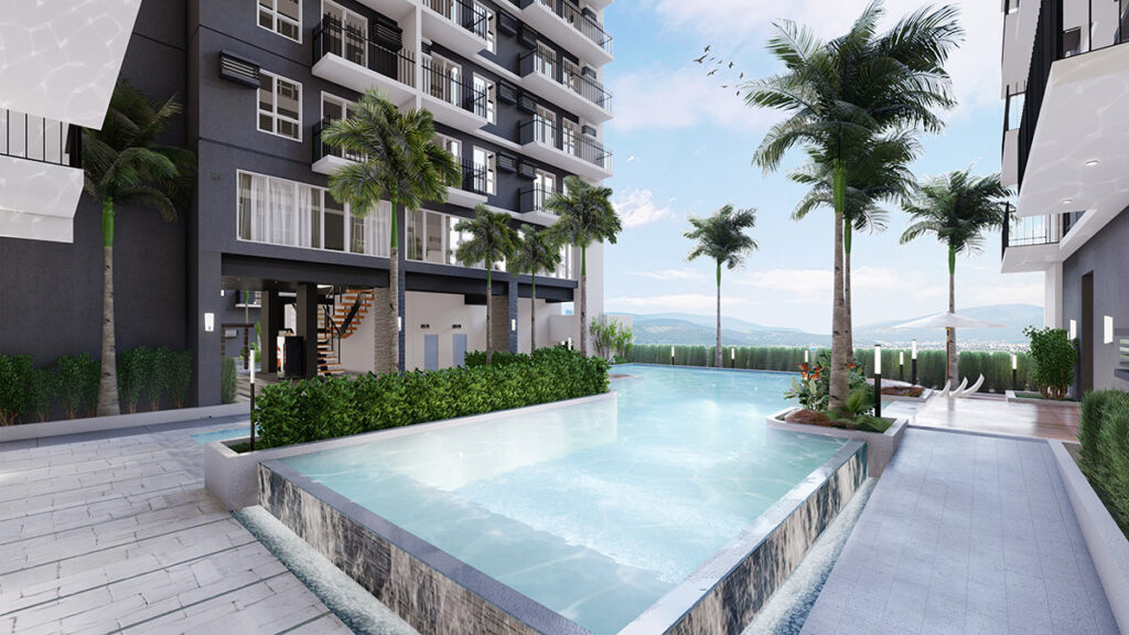 Among its outdoor facilities are a swimming pool, a kiddie pool, a landscaped garden, an outdoor lounge, a multipurpose area, a pool deck/pool lounge, a children’s playground, a jogging path with benches, and a jacuzzi.