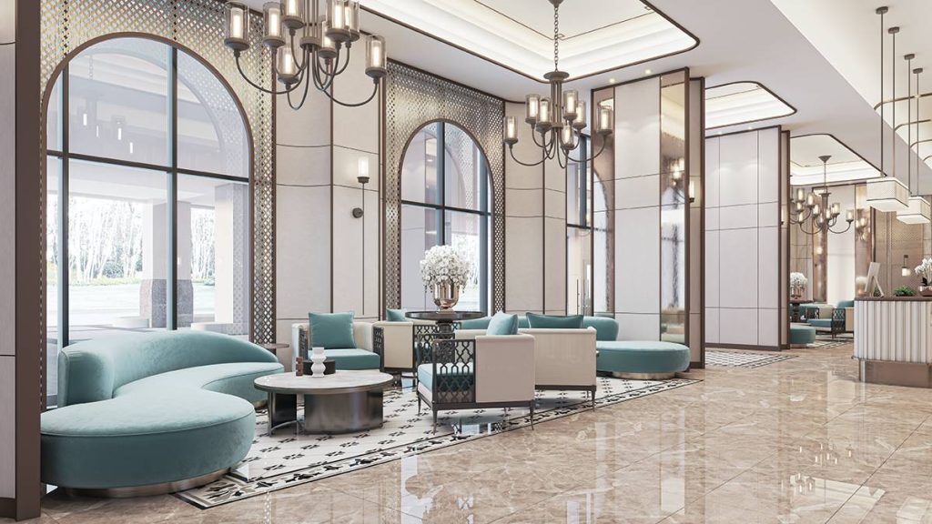 Guests and residents will receive a grand welcome at the main lobby of Saint-Marcel Residences, with huge arched floor-to-ceiling windows giving an interesting outline of the space.
