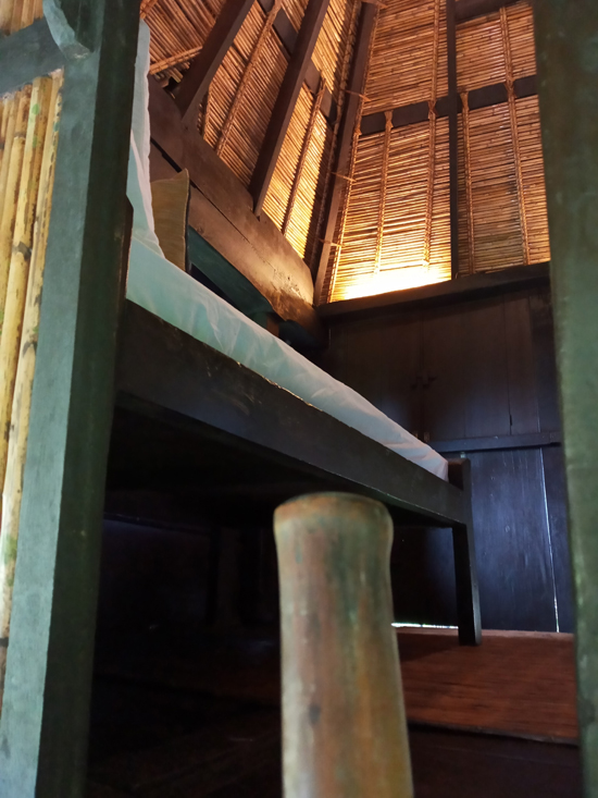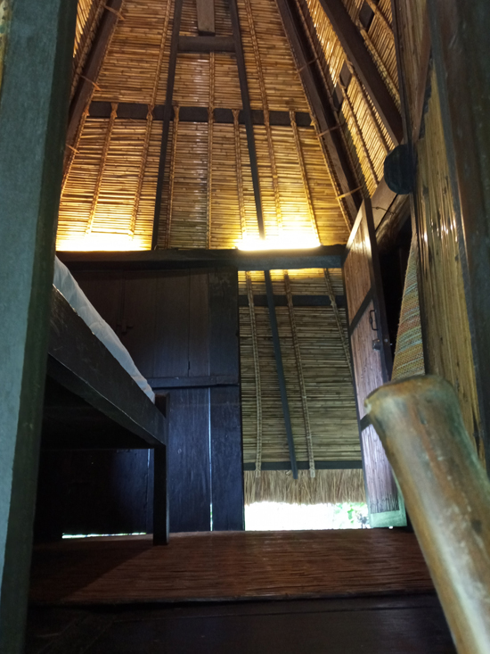 An Ifugao hut is a square, window-less abode that is elevated from the ground with the use of four sturdy and heavy posts. Rat-guards are built into the posts and the ladders are removable. Inside, there is a single room for sleeping and cooking, a fireplace, and an attic that serves as storage. The open space underneath is used for chores and entertaining.