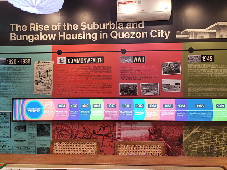 A historical timeline showing the rise of suburbia and bungalow housing in Quezon City is displayed in the main dining area. Large maps show the original housing development plans and the growth of various districts.